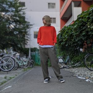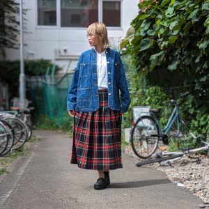 チェック柄の秋らしいシャツには、すっきりシルエットのコーディネート💃