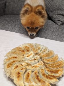 旦那が作った餃子が気になる様子。